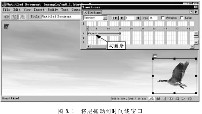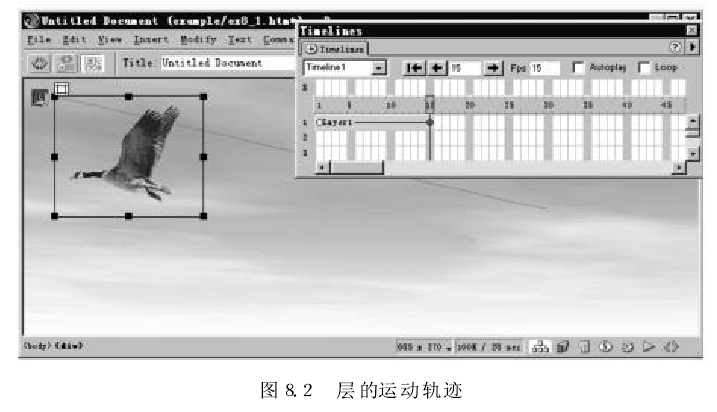 (1) 在頁面中添加一個(gè)新層,在層中插入圖像 ing8-2,gif,然后將層移動(dòng)到動(dòng)畫的起始位置。