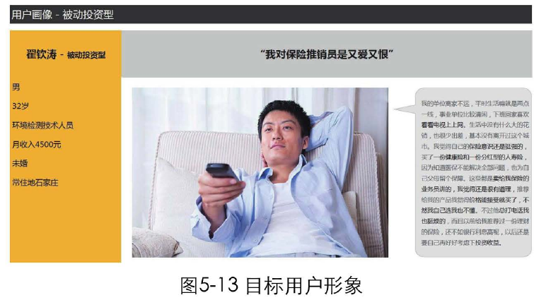 有的產(chǎn)品經(jīng)理和設(shè)計(jì)師還會(huì)把目標(biāo)用戶(hù)的特征抽象成具體的人物、制作成卡片,貼在自自己的辦公桌上,時(shí)刻提醒自己,這才是我的目標(biāo)用戶(hù),我做需求、設(shè)計(jì)決策時(shí)要圍繞他來(lái)考慮。他的使用場(chǎng)景、使用目標(biāo)是什么?我們希望他如何使用我們的產(chǎn)品,以實(shí)現(xiàn)我們的商業(yè)價(jià)值?如圖5-13所示,這是一個(gè)虛擬的目標(biāo)用戶(hù)形象。