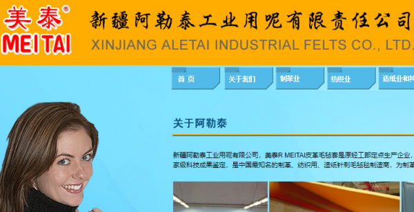 新疆阿勒泰工業(yè)用呢有限責任公司,成立于1966年,是原輕工部定點生產皮革毛氈套企業(yè),先后多次承擔省部級科技創(chuàng)新項目,在皮革、紡織印染、造紙行業(yè)等多項科技成果通過國家級科技成果鑒定,是中國最知名的針刺毛氈套制造商,為制革、紡織、造紙廠商提供50多種不同型號、用途的皮革毛氈套、預縮加厚呢毯、造紙毛毯。美泰 MEITAI 氈毯直接服務客戶,2012年獲中國紡織科技進步二等獎,2013年獲全國工商聯科技進步優(yōu)秀獎。產品替代進口,填補國內空白,整體技術與產品綜合性能達到國際先進水平。產品遠銷國內二十多個省市自治區(qū),并出口歐亞、非洲、美洲國際市場。