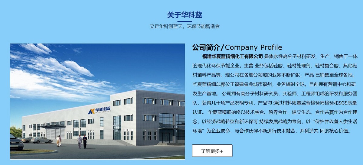 福建華夏藍(lán)精細(xì)化工有限公司 是集水性高分子材料研發(fā)、生產(chǎn)、銷售于一體的現(xiàn)代化環(huán)保節(jié)能企業(yè)。主營(yíng) 業(yè)務(wù)包括鞋膠、鞋材處理劑、鞋材復(fù)合膠、其他鞋材輔料產(chǎn)品等。現(xiàn)公司在各細(xì)分領(lǐng)域的業(yè)務(wù)不斷擴(kuò)張,產(chǎn)品 已銷售至全球各地。