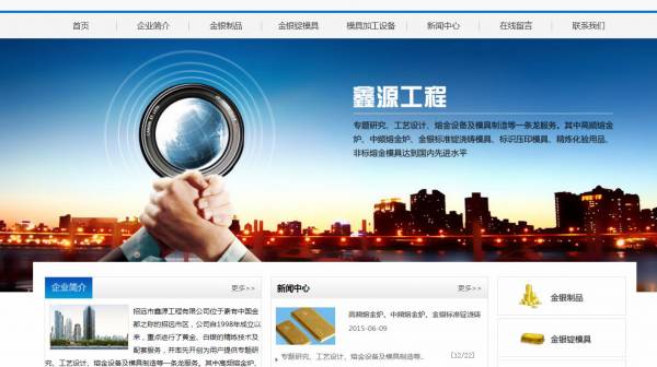 招遠市鑫*工程有限公司選用我司企業(yè)機械設(shè)備行業(yè)的網(wǎng)站優(yōu)化產(chǎn)品,其SEO關(guān)鍵詞有 山東招遠市鑫*工程有限公司-高頻熔金爐、中頻熔金爐、金銀標準錠澆鑄模具、標識壓印模具、精煉化驗用品、非標熔金模具。其特點是用很合適的展示方式、展示效果、站點框架,把客戶及其用戶很關(guān)心的問題突出表現(xiàn);并以簡潔明朗的設(shè)計風(fēng)格,清晰展現(xiàn)公司水平實力,確保一秒抓住目標用戶眼球,給用戶留下良好的第一印象。招遠市鑫*工程有限公司成立于2004年,是經(jīng)招遠市市場監(jiān)督管理局審核的有資質(zhì)的公司,其統(tǒng)一社會信用代碼:91370685769**46071 。公司地址:山東省招遠市郭家埠紅綠燈西。